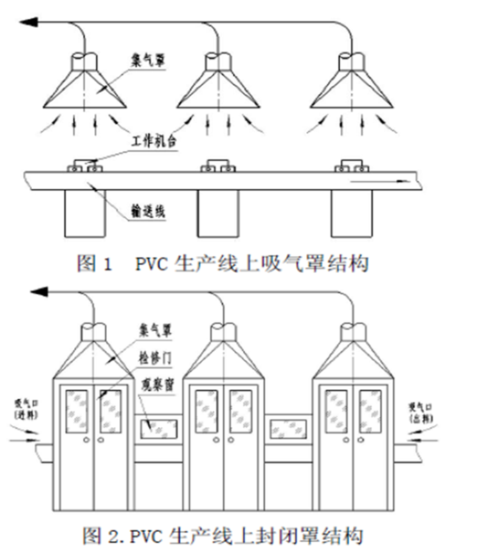 图1为PVC产品的印刷车间生产过程中集气罩结构,由于化工原料散发出刺鼻的气味,及有害气体的浓度极高,虽然加装了大功率的抽气吸味装置,由于机台转动工件随输送线运动及风扇等横向气流的干扰,集气罩结构不理想,捕集效果不好,致使大量气体外逸。针对这种情况改成密闭型结构如图2所示,将输送线全部密闭,由进出料口进风,通过罩口进行抽吸空气,使密封罩内保持负压,这样有效的控制了污染空气的扩散。从理论上分析,罩内的排风量Q为:Q=VA(m3/h)