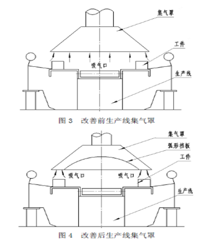 图3为工业生产中广泛使用的装配加工生产线的集气罩结构,采用大尺寸罩口,罩口吸气面积A较大,需配以较大排风量,因而不能有效集中控制风量吸捕污染源散发出来的污染气体。若将其设计改为如图4所示,即在罩内加装弧形挡板,使整体大罩口被分隔成小罩口,对准工件(污染源)上方,这样大大减小了罩口面积A,相应排风量Q减小,使用较小的吸风量即有效的控制了污染气体的逸出,产生了较好效益。图5为循环烘箱工件脱模工序的集气罩结构,经加热后的化工制品及模具离型剂,产生了大量的有害气体,为了有效吸气和不妨碍工人操作,将集气罩置于工作台的正上方,罩口距离较远,这样不仅增大了罩口的吸气范围,而且容易受到室内其他气流干扰,同时在污染气体抽吸入罩口过程,经过操作人员的口、鼻,直接危害工人的健康。