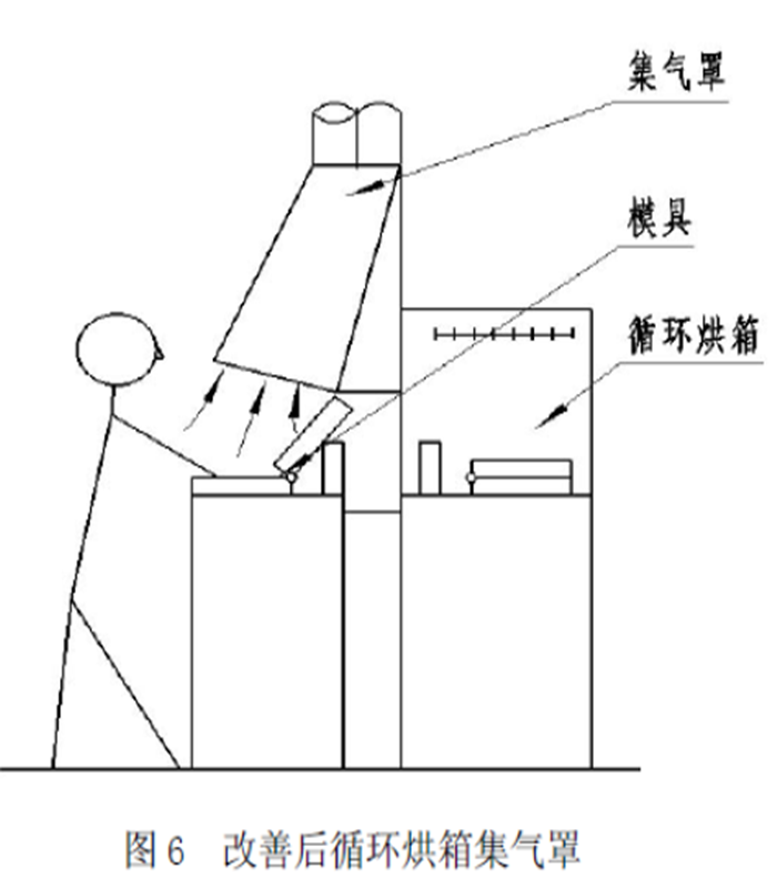 若将其设计改为如图6所示,即将集气罩置于操作人员的另一侧,并贴近污染源,这样使集气罩口面积减小,排风量也降低,用较少能耗得到所需的捕集速度,同时避免污染气体被吸入操作人员的口、鼻,改善了工作环境,保证了工人身体健康。